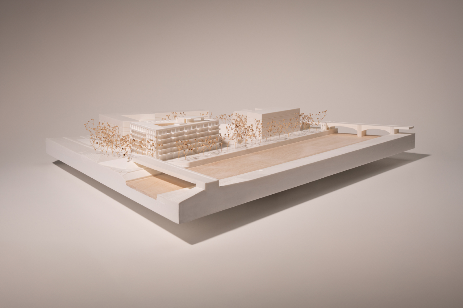 Bytový DůmPelčák architektiPlzeň2024Soutěžní model Měřítko: 1:500 Spolupráce: Ondřej Drahokoupil Soutěžní model byl vyroben pomocí 3D tisku a doplněn o zjemňující prvky - dřevěnou plochu řeky a dva typy sušených rostlin pro znázornění stávajících a návrhových stromů.Další Projekt →